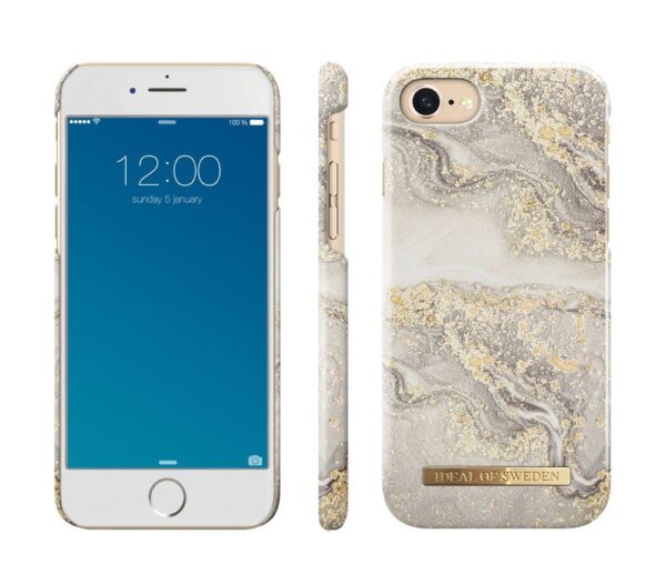 iDeal of Sweden Fashion Case Sparkle Greige Marble iPhone 8/7/6S. Met zanderige nuanceringen en metaalachtige highlights, geeft het draaierige marmeren ontwerp een natuurlijke warmte en een beachy gevoel. De natuurlijke structuur wordt gecompenseerd door delicate gouden sprinkels voor een sprankelende afwerking. De back cover is vervaardigd uit sterk, maar flexibel plastic en de microfiber voering voorkomt krassen.