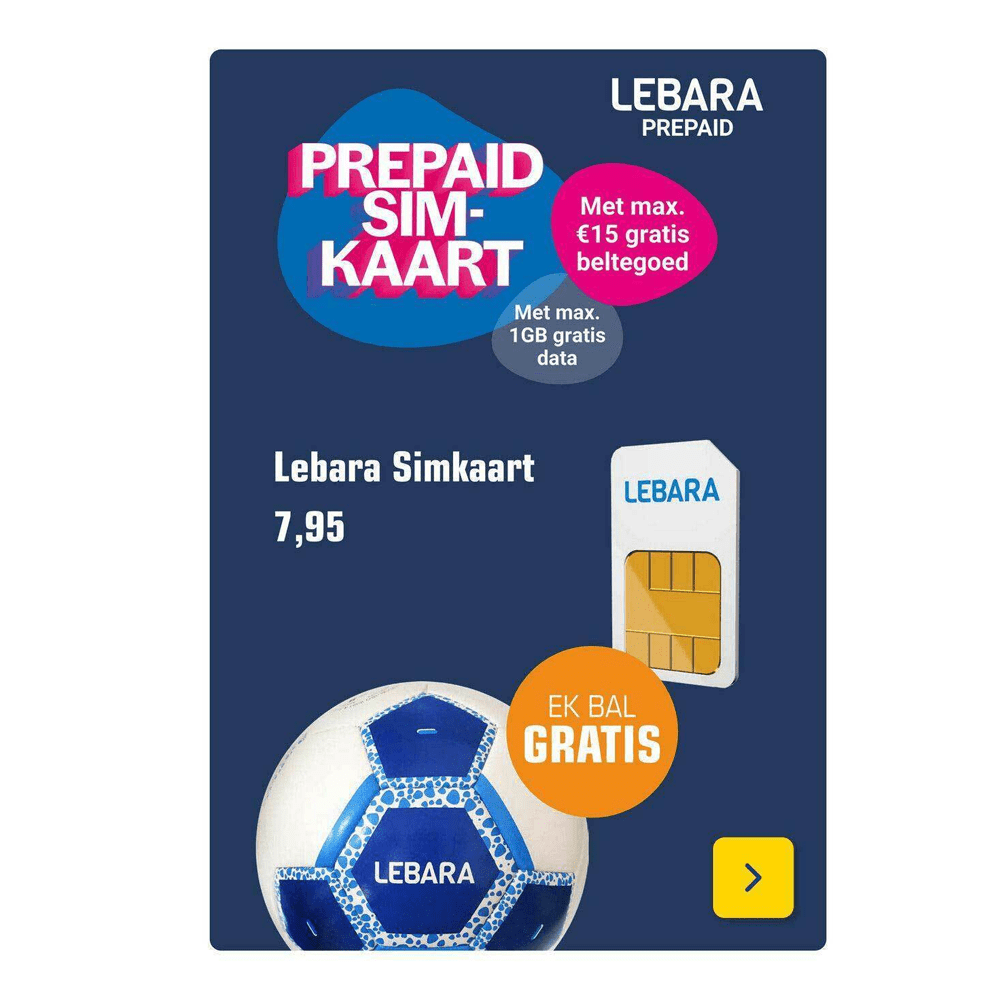 Lebara Prepaid simkaart met 15 euro beltegoed – Gratis EK voetbal Bij deze Prepaid simkaart van Lebara krijg je 15 euro beltegoed en 1 GB